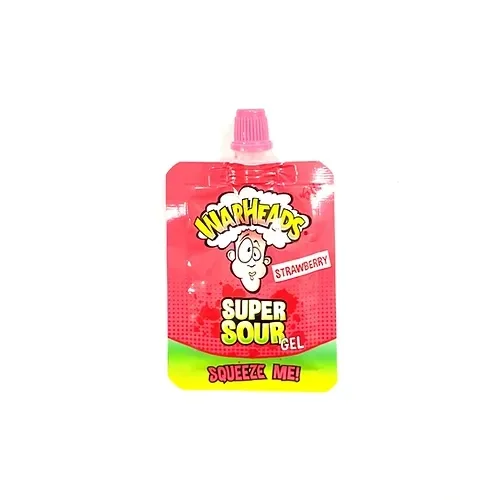 De Warheads super sour gel is een zuur knijpfruitje met een aardbei smaak.